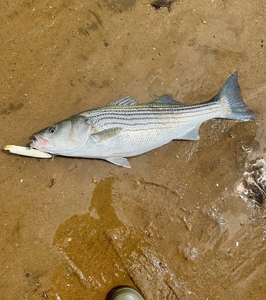 “The striped bass fishing is heating up off outer Cape Cod! Recently, light green or white topwater plugs are producing the most strikes, landing fish from mid 20-inch class to slot size. The water temperature is still on the cooler side, but it’s great to see these fish in the usual shallow spots. We look forward to the boat activity picking up this way soon!”