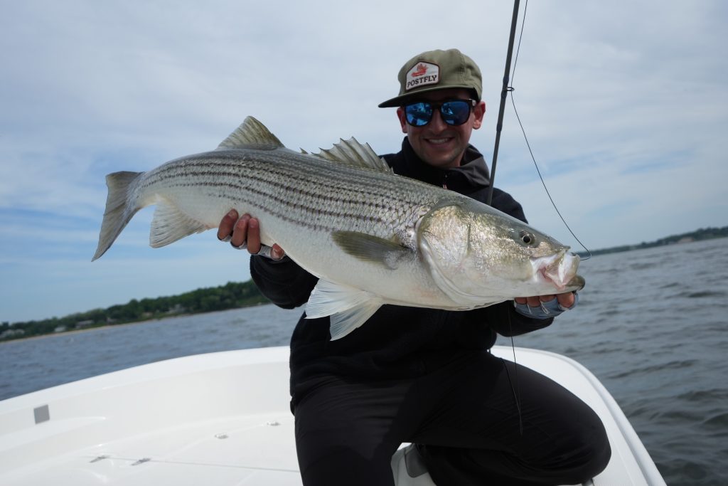 At 9 a.m. I made the decision to head east toward Eatons Neck in search of a goliath bass. Along the way, I was able to find pods of bunker and what looked like tailing bluefish, however, the blues refused to indulge in my plugs. Upon arrival at Eatons, I marked a few bass, but nothing notable. After puttering around the area it was clear that boat traffic and slack tide had turned the fish off, so we slowly made our way back toward Manhasset. As we traveled back the calm wind subsided and a northeast blow kicked up the Sound. To put it plainly, we were getting slammed around by some sizable waves. That said, when we finally reached Manhasset we were greeted by some gentler seas and some schoolies. After cranking a few 20-inch fish we decided to go back on the prowl for some larger class stripers. Setting up in a calm cove, it didn’t take long to find stripers erupting on bunker. Out of thin air, 20-pound class fish were jumping on our plugs and flies. I was able to put my buddy Chris on a 15-pound personal best striper while also whomping on a 22-pound fish myself.