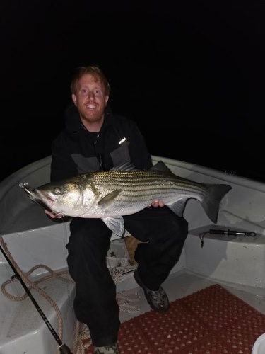 “On May 7th I left the dock at midnight for the tide swing; a good fog and overcast conditions with barometric pressure drops fueled an epic bite. I stumbled across schools of hundreds of bass feeding on the surface between 5 and 15 feet of water along the edges of a drop off from a flat. Butterfish and adult bunker were on the menu. Shortly after arriving on scene the bass settled in on a large rip. My brother and I went cast for cast on 30- to 44-inch bass which were eating anything that swam by the boat. Our total tally was 60 bass caught and released between the two of us. Most fish were taken on light custom-made bucktails, however, SP minnows and Danny plugs did their fair share of damage as well.”