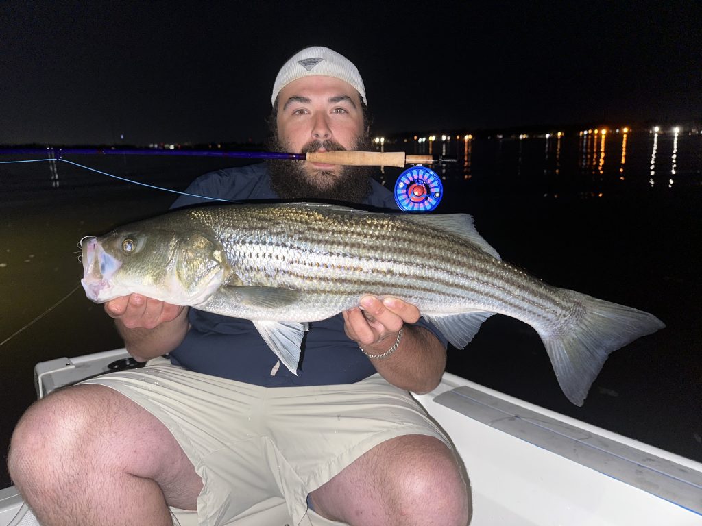This past week I fished every sunset and night tide. At the beginning of the week I spent my efforts fly fishing the bridges on the south shore. Although fishing wasn’t too hot, I did lose a decent-sized fish I estimated to be 15 pounds. The following night I focused on targeting big bass on metal lips in the Western Sound. Unfortunately, I wasn’t able to coax one into eating, however I did mark some giants. Toward the middle of the week I got some bunker from a local shop and ended up chunking up a 30 pounder with my buddy Andrew. The key was a weightless bunker head drifting on the bottom. On Wednesday night, I broke out my fiberglass 8-weight rod to hammer schoolies on dock lights. To say the least it was a blast keeping my rod bent on some fun size fish. Andrew even managed a 9-pound striper on a 5-weight fly rod.
