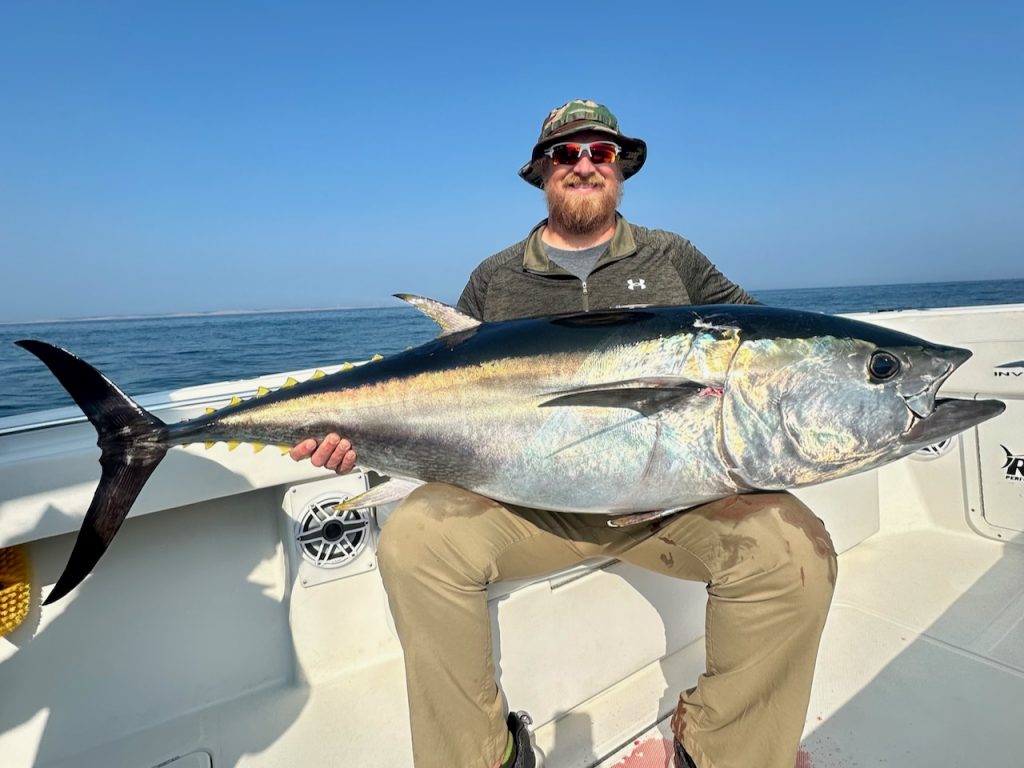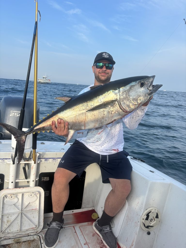 Captain Ross of Cape Cod Charter Guys in Bourne has also been fishing in CCB this week, where he said they were enjoying some consistent action from big stripers until the blues moved in around the pogie schools. They’ve been avoiding the live-line game and instead are opting for topwater early in the morning when the fish are more active on top. But, later in the day, vertical jigging his hand-poured diamond jigs in 120 feet of water has yielded some quality stripers as well, without any real interference from the bluefish. The skipper added that there are a bunch of bonito around too, and he even trolled a few up for a couple days in Cape Cod Bay, but they haven’t taken the time to go out of their way for hardtails just yet—it’s still early!