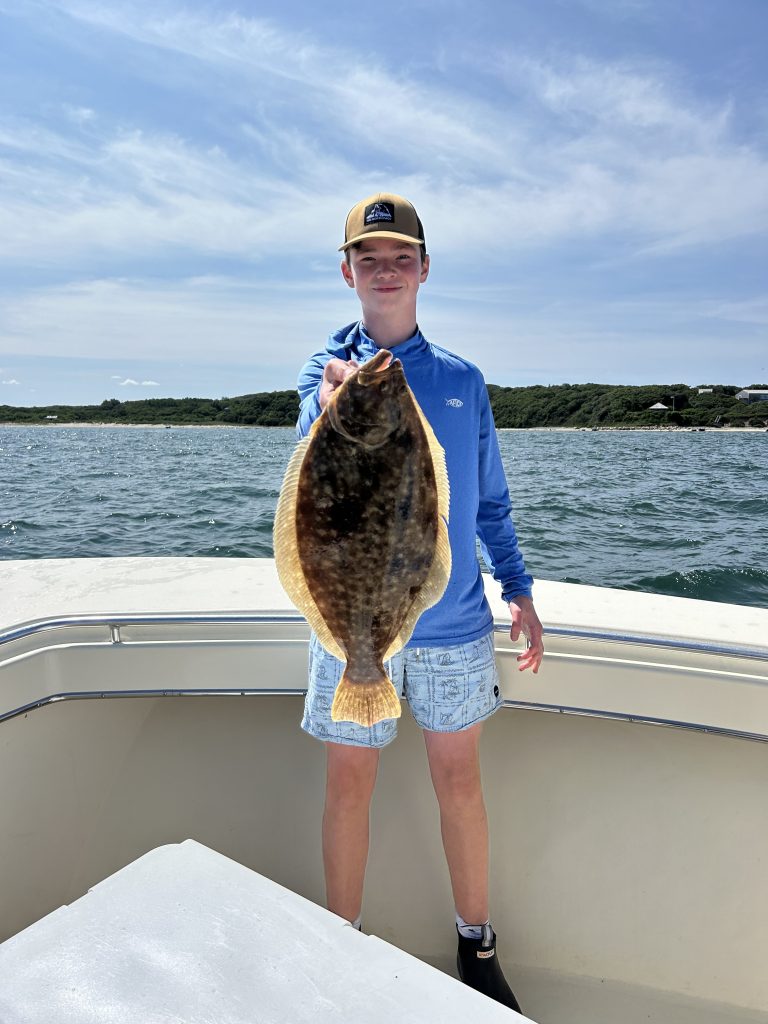There have been a few days that were too windy to get all the way around to Wasque, so we stayed a bit closer to home. There are still lots of birds working over schools of baitfish in Vineyard Sound, and this week we finally found some striped bass and bluefish on them. JR Moore and sons Trey and Andrew pulled a couple of stripers out from under the birds on Friday, Madeline Garman caught a bluefish off Cape Poge on Monday and Michael Murray caught a 10 lb bluefish this morning. On most of these trips, we’ve split our time between casting for bass and bluefish and drifting for fluke, sea bass and scup. The bottom fishing hasn’t been great, but persistence has paid off with a few nice keepers among many smaller fish.”