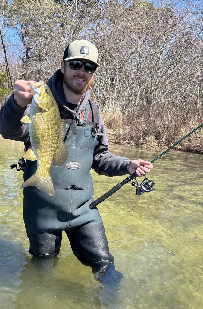Smallmouth bass fishing has also been good in the kettle ponds from Upper Cape to the Outer Cape. Small soft plastics, like Ned rigs, and hair jigs fished low and slow for recently stocked trout have been duping some bronzebacks for shore and wading anglers. But smallies will also readily hit jigs, jerkbaits, crankbaits, and paddletail swimbaits. My buddy Ryan caught a nice one on a white Keitech while wading a Lower Cape pond earlier this week.
