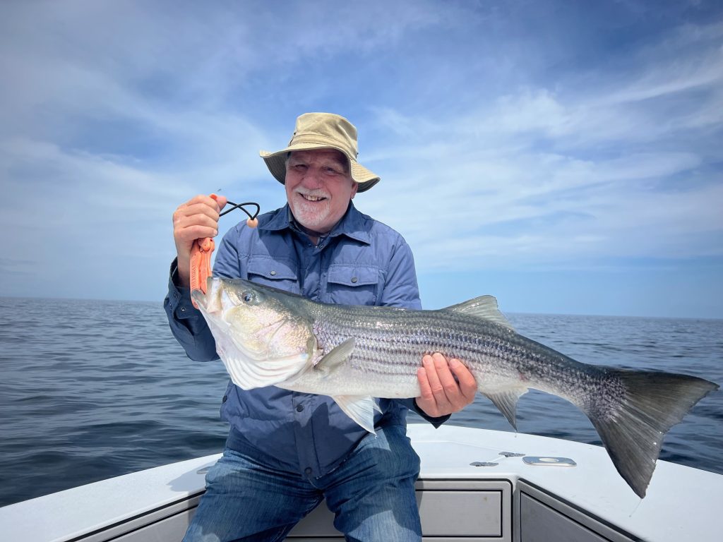 Captain Matthew Dempsey of Salt Reaper Charters in Dennis reported: “Cape Cod Bay is starting to heat up in a big way, with many large over-slot fish. The fish seem to be keying in on sand eels and mackerel in 20 to 40 feet of water. The Hogy XL Dog Walker and other large topwater plugs seem to be doing the trick, along with vertical jigging once the fish go down.”