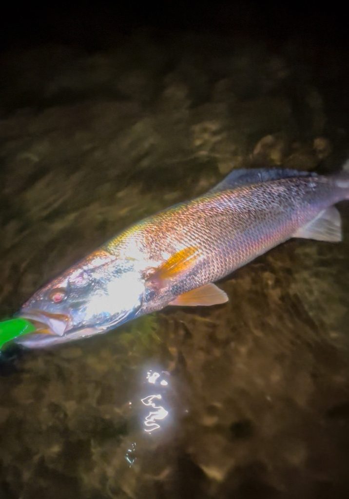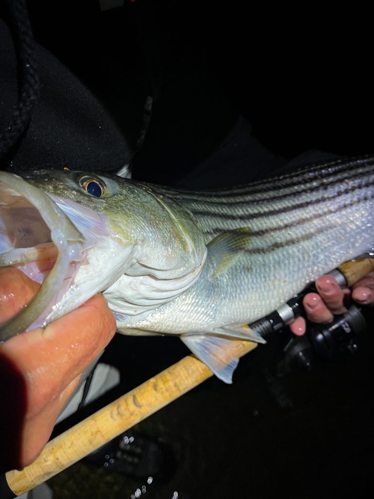 Whether the bass are eating bunker or herring, they’re showing a preference for bigger baits in the backwaters. My buddy Andrew Burke caught a nice bass pushing 28 inches on a 7-inch Slug-go, crept slowly along the bottom, while we were fishing a narrow choke point during the start of the ebb tide last night. Smaller plastics and plugs were ignored.