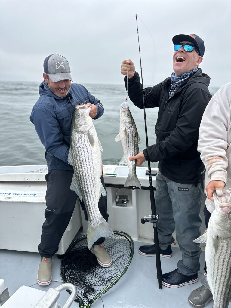 Captain Drew Downing of Down East Charters in Chatham reported: “We’re seeing bass of all sizes down here now. They’re really widespread though, and bait is ranging from tiny stuff under terns to bootstrap squid, butterfish, and the occasional pogie school. Fun fishing! No monster bass yet, but a whole lot of decent-sized fish in the area.”