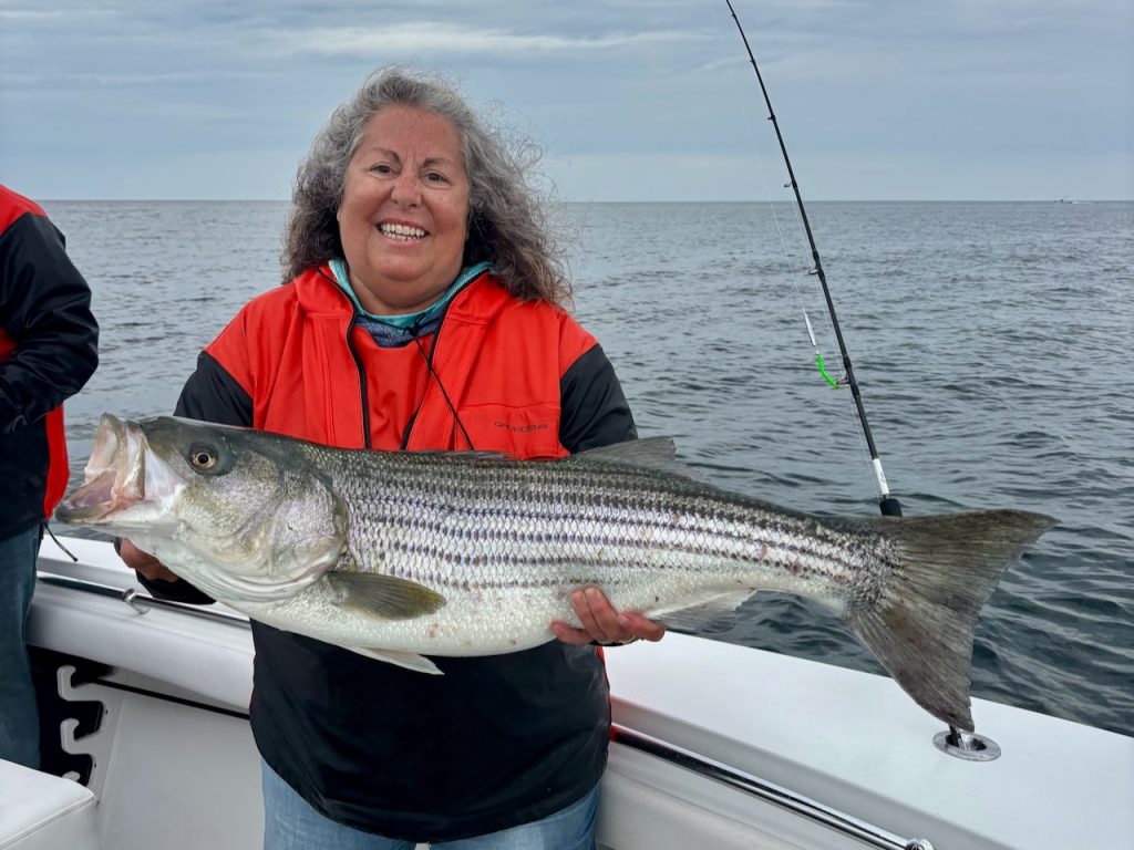 Captain Mike Rathgeber of Cee Jay Fishing in Provincetown reported that striped bass fishing has “busted wide open” with limit catches coming in on his private charters of 10-20 fishermen, as well as the public trips. Many over-slot fish to 40 inches have also come over the rail with some jumbo bluefish mixed in.
