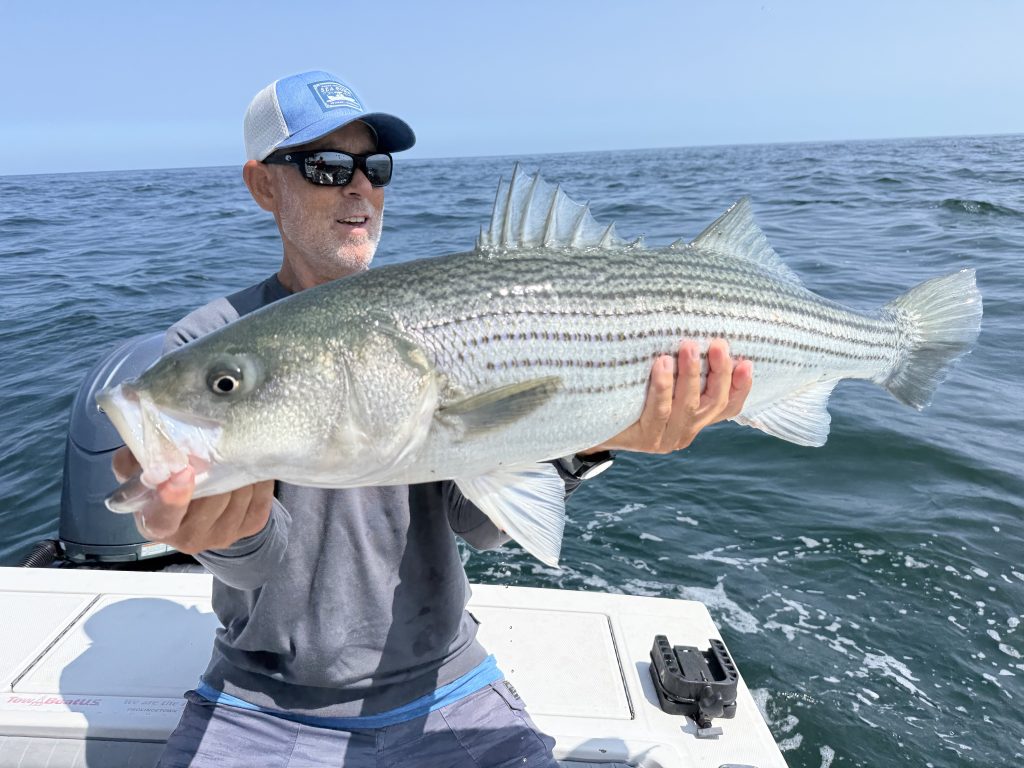 Captain Mike Rathgeber of CeeJay Fishing in Provincetown reported: “It was an epic week on striped bass with a few bluefish and bonito mixed into the catch for both large private charters and public trips. More and more bass are slot-sized, too. Any time you limit out a boat of 30 people, you know it’s been a good day. The bay and the ocean both have a lot of fish and there’s plenty of bait around to keep them here.”