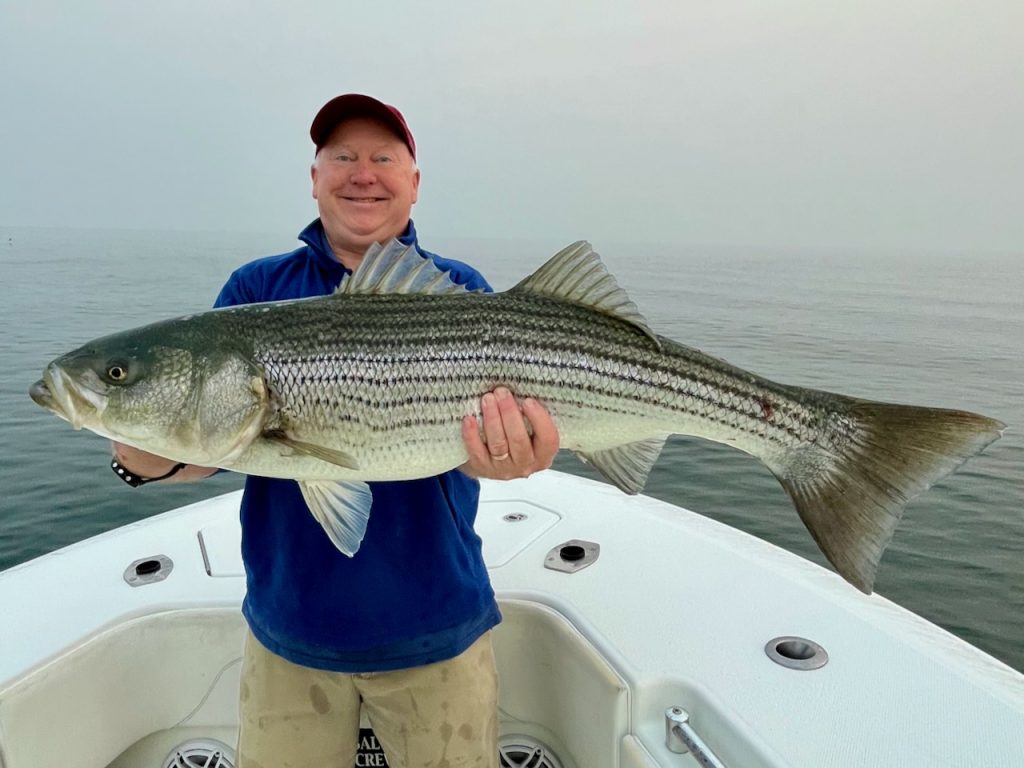 Captain Elena Rice of Reel Deal Fishing Charters in Truro reported: “What a week to be grateful for consecutive days of favorable marine conditions off outer Cape Cod and the continued presence of striped bass surface shows! We’re trying not to get spoiled, but the acres of topwater splashing stripers has sure been nice to see most every day. Lighter-colored slim-profile lures reeled with a slow twitch are generating multiple bent rods while our tube-tailed diamond jigs wait their turn for the later afternoon hours. Awesome to have such a great striper bite still going strong into August. We have one opening left for the upcoming weekend—check it out here!”
