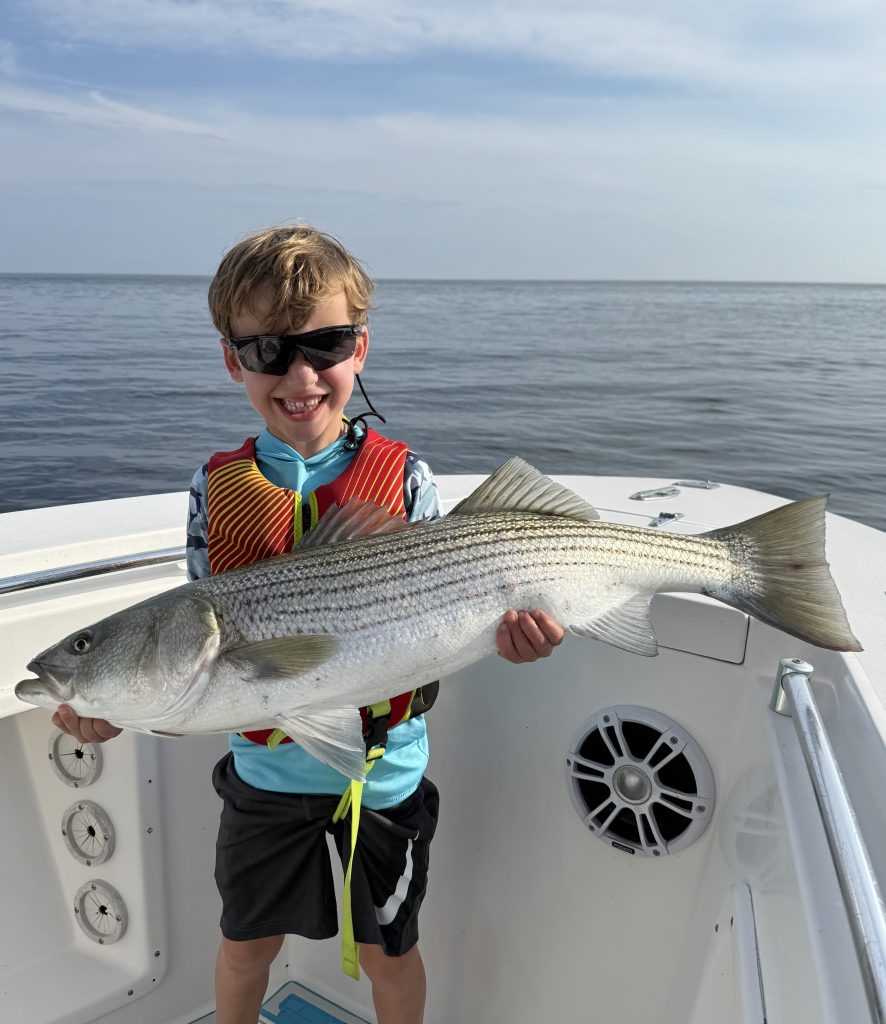 Captain Scott Worth on the North Fork reports: “Needing a change of pace from chasing tuna, I took my 6-year-old son Declan bass fishing out east. We casted Albie Snax along the rocky shorelines and hooked into some nice bass. The fish were on high alert with all the brown sharks cruising around, but we managed to get them to eat and safely bring them to the boat!”