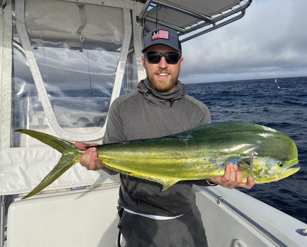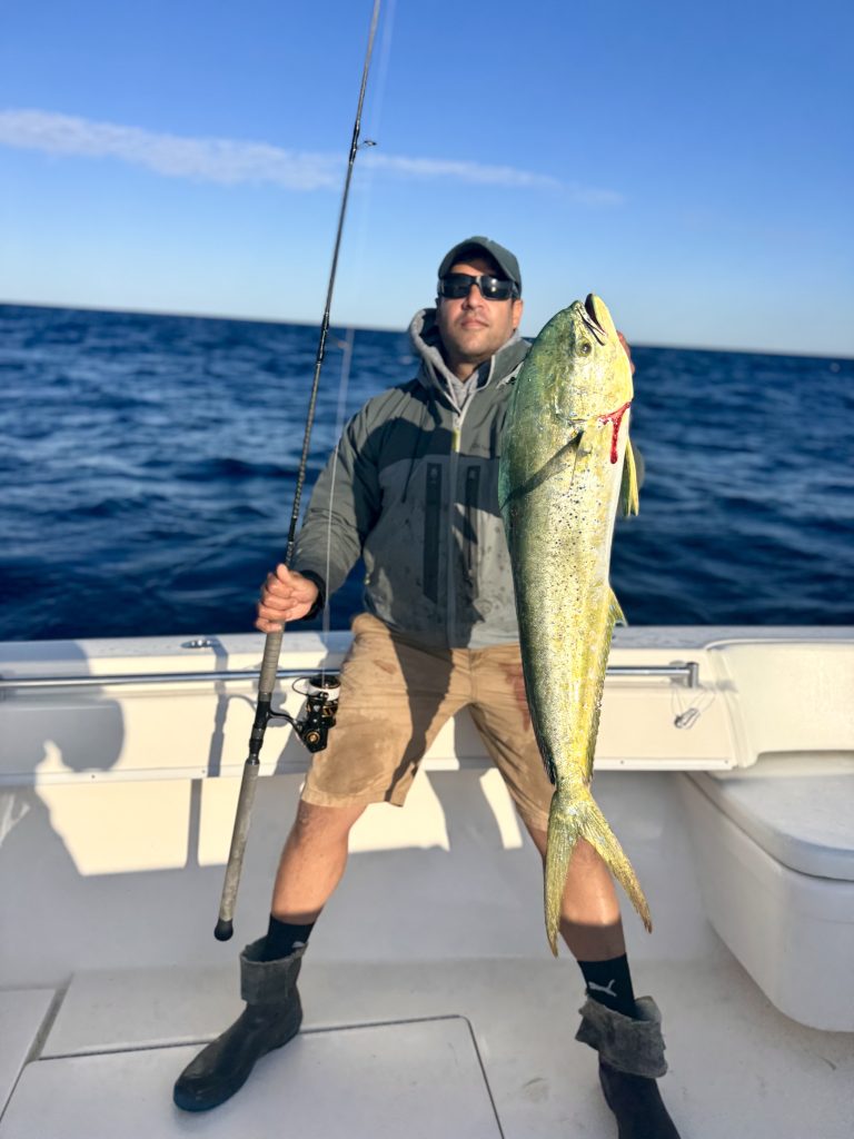 Captain Scott Worth on the North Fork reports: “On our first trip out to the tuna grounds after Hurricane Erin, life was sparse and the tuna bite was slow, likely due to cooler water temps. Things should improve once conditions stabilize. Fortunately, we found some large mahi—up to 40 inches—on light tackle around the high-fliers. Fast runs and high jumps made for battles similar to tarpon!”
