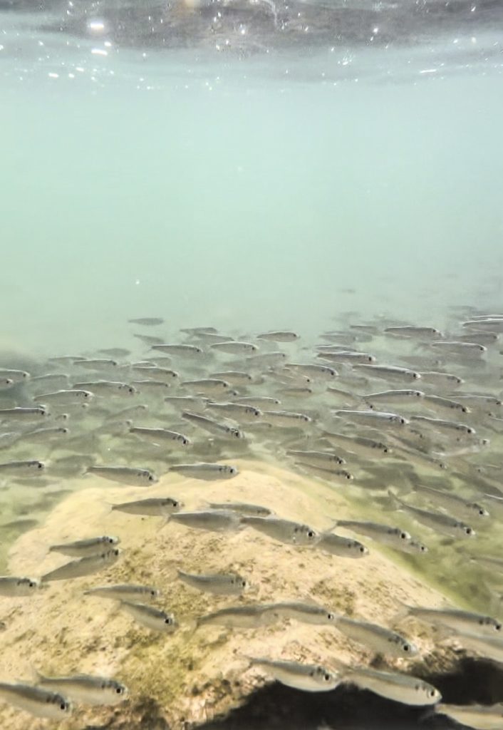 Recently stocked rainbow trout are feeding aggressively in the ponds on shiners, small panfish and herring fry. Last week, Christian from Sports Port in Hyannis shared that he’d been doing well with ‘bows and smallmouth in mid-Cape ponds, and this week, I experienced a similar bite on the upper Cape. Some respectable rainbow trout pushed schools of young river herring against a wind-blown shoreline and for hours, I moved up and down the beach and caught them on spoons. The fish were in so tight that casting parallel to shore produced better results than casting straight into the wind and deeper water. Whether I retrieved slow and steady or fast and erratic, they showed no preference and frequently chased the lure to my feet. I imagine small Baker Lures jerkbaits and Rapalas would have worked very well, but in the interest of releasing each fish with care, I steered clear of anything with dual treble hooks. Metal was a better imitation of their forage anyway. And it wasn’t just rainbow trout enjoying the hordes of herring—a big smallmouth bass joined the party but spat the hook with a 2-foot-high jump just a few feet from my rod tip.