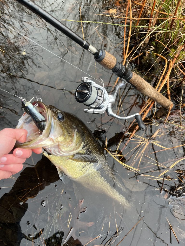 Largemouth fishing was much tougher this December than it has been in a few years, and the same goes for pickerel despite their willingness to chase down baits in cold water. But some anglers, like my friend Noah Lamperti, were able to stick a few bass before the ponds began to freeze over. Surprisingly, Noah caught a respectable largemouth on a wakebait in an outer Cape pond during Christmas Eve’s wintery mix of rain and snow.
