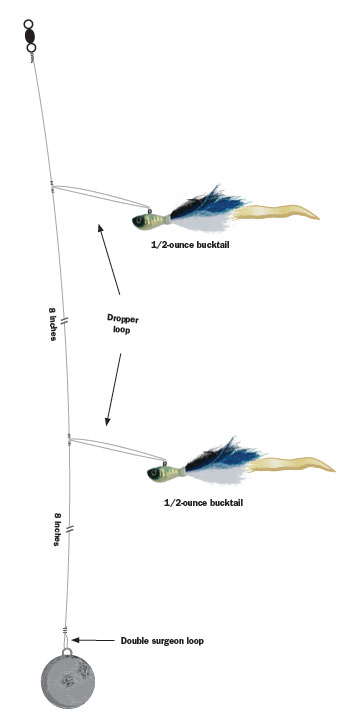 For lead, bank and cannonball sinkers between 6 and 20 ounces will cover any depths and drift conditions you might encounter. For jigging, bring bucktails from 4 to 8 ounces, and don’t forget the Berkley Gulp to tip your jig and the teaser hook above it.