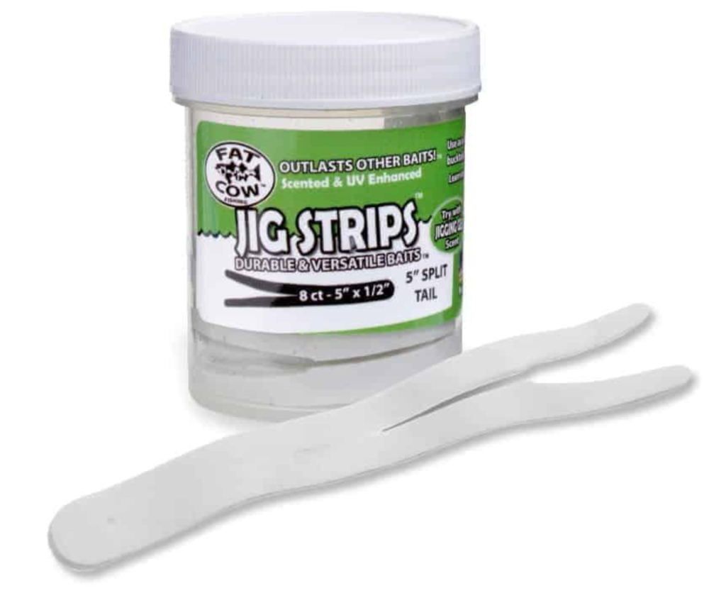 Cut into similar shapes as natural pork rinds, synthetic trailers first gained popularity with tube-and-worm trollers before catching on with bucktail casters. While many are made in the same shape as the Uncle Josh Sea Strip, some are curled to give them additional action as the jig moves. These are added to bucktails the same way as natural pork rind, by pushing the hook through the tip of the trailer and allowing the bait to dangle off the bend of the hook.