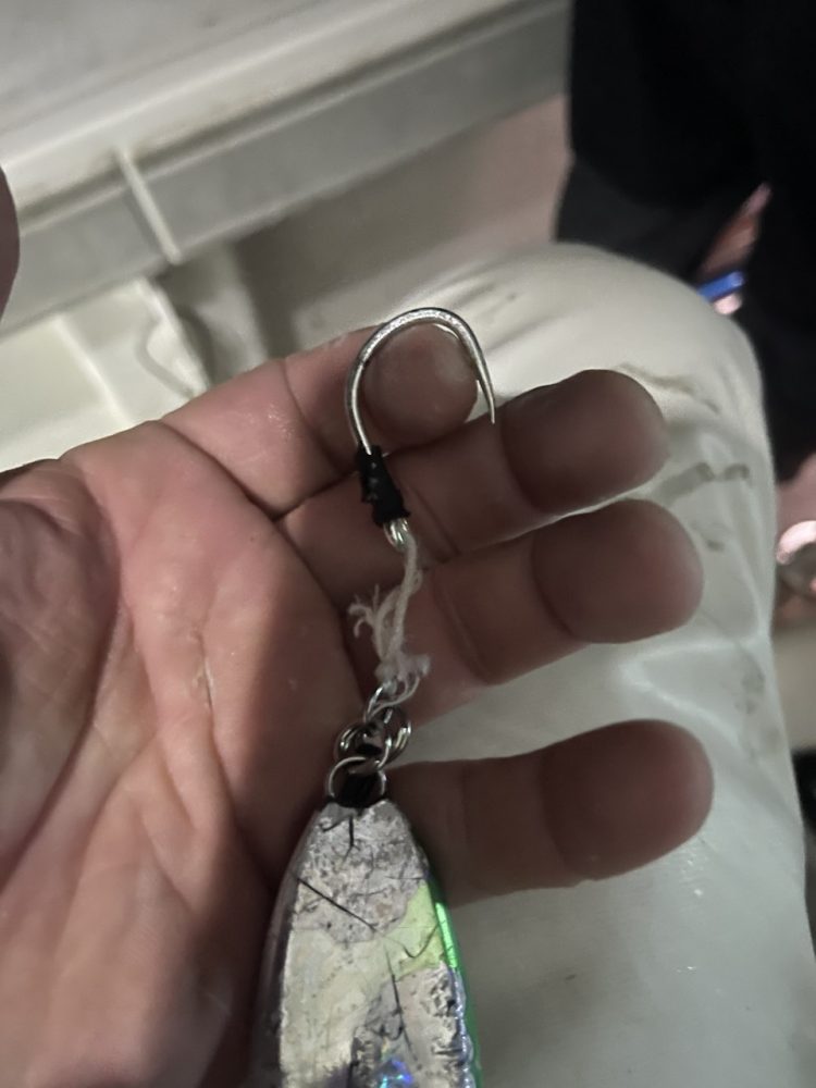 “I couldn’t believe we were still buttoned up to this thing”, Vantine said. The team would later find out that the perfect hook placement is what gave them a shot at landing this fish. “The hook didn’t pull because it was pinned in the bony plate at the top inside corner of the fish’s jaw. There was a good period where the jig was definitely rubbing against the fish’s teeth instead of the leader”, said Tanionos. The strength of their terminal tackle baffled them. On top of the line and leader performance, Bach added “I was on the rod for probably an hour or so toward the end, and I just couldn’t fathom how I was able to turn this fish’s head with this little slow pitch rod. It was beyond impressive.”