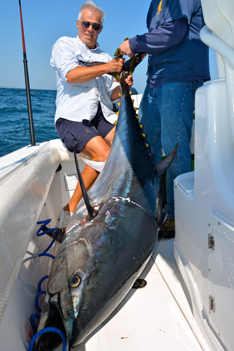 The striped bass fishing did not disappoint as multiple keepers were landed shortly after reaching the hot spot. A brief while later, the tuna show began. I grabbed my casting rod and started throwing lures out along with the other anglers on board. Doubled up! Two hook-ups quickly materialized although they too soon dissolved into the horizon as we lost both fish. I couldn’t help but feel as if Ron was standing behind me shaking my head saying, “Bobby, what are you doing? You know it is time to go vertical”.