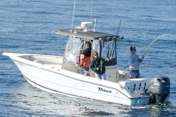 Going the distance is no problem on the 24. She came with a 151-gallon gas tank, and for the fishing that I do, I never worry about running out of gas or carrying extra on board. My business is not geared to offshore fishing, but I have taken her out on the occasional offshore trip. The Triton 2486 came equipped with Taco outriggers that mount to the T-top. We have trolled for tuna 25 miles offshore, and with the outriggers we were able to troll 6 rods at once. We managed to catch a couple 50-pound tuna, and still had plenty of gas in the tank. Having a Yamaha 250 High Pressure Direct Injection (HPDI) motor is a plus. This 2-stroke engine is second only to the 4-stroke model when it comes to fuel efficiency. I burn approximately 13 gallons per hour at 4300 rpms, which is around 32 miles per hour, depending, of course, on the sea conditions at the time.