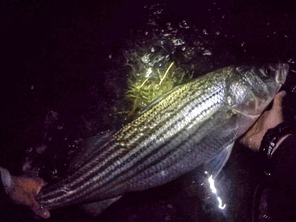 I begin my search in the back bays by fishing an incoming, afternoon tide. The exposed bottom during the morning hours heats up and creates a thermocline as the tide rises, and this is where resident bass are more active. The water warms up first in shallower bay areas, so that’s where I focus. I begin by casting parallel to the shoreline and then fan-casting further away until I raise fish. Because stripers are cold-blooded, their activities are dictated by body temperature, which means the surrounding water temperature is very important.