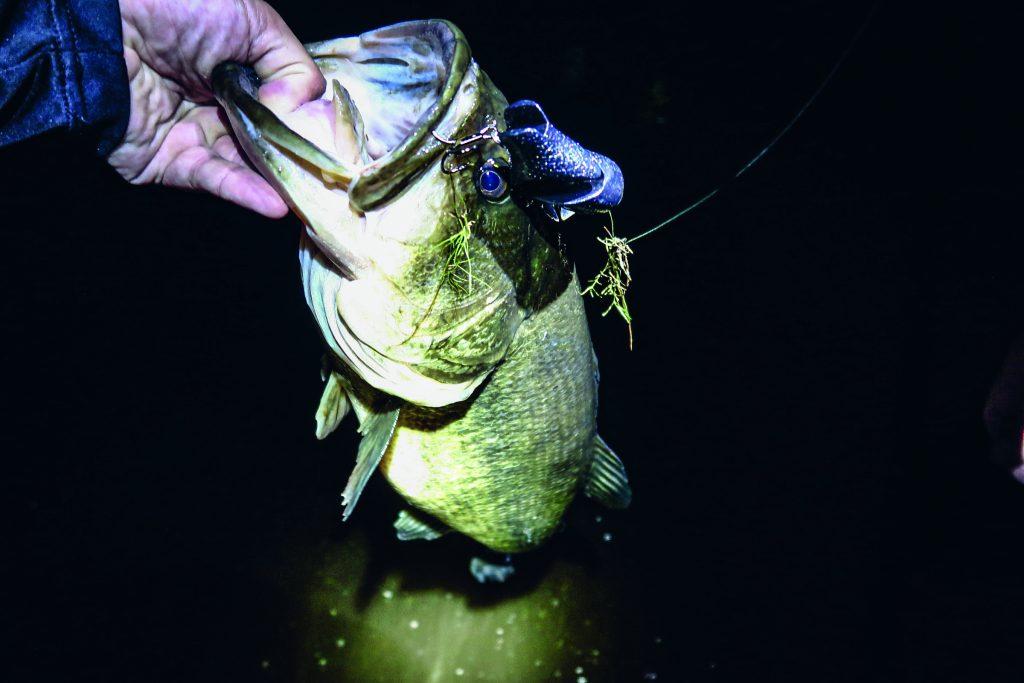 As my eyes slowly adjusted to the chilly moonlit surroundings, it was what I began to hear that tipped me off to the fact that something was very different about my finesse fishery after dark. The trout and sunfish, usually finicky in daylight, were pushing in the backs of pockets, rolling on insects and what I assumed were perch fry. And then, every 10 minutes or so, there’d be a louder boil—under a dock or across a pocket in the bushes, an unmistakable blow-up. Close-minded and conditioned by years of fishing this pond in a similar manner, I rationalized sitting out on a point for more than a half-hour, all while listening to the irrefutable truth coming from the shallows. After hauling nothing but water on Ned rigs, finesse swimbaits, and under-spins, I had nothing to lose, so I slid in to satisfy my curiosity.