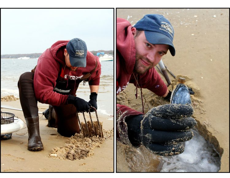 Start out in a spot that has a concentration of tiny holes in the sand and use the plunger-end of the pole. It’s similar to plunging a toilet, except you don’t want the plunger head to make direct contact with the bottom. (Even though it’s made of rubber, it can still crush a steamer’s delicate shell.) Try to stop the downward momentum just before you make contact with the bottom. The plunger will begin forming a crater in the bottom. Go fast and furious on the first go-around since the steamers are going to be at least 6 inches down. Once you get a decent hole started, flip the rake around and use the basket to sift through the debris in the hole you created. You’ll be amazed with the stuff you sift up: old shells, crabs, crazy-looking worms, and other oddities. Don’t be surprised if you get a few quahogs in the top layer.