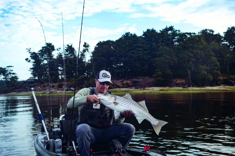 “The advantage of using a kayak over surfcasting is that these fish are constantly on the move,” said Mike Baker, owner of Kayak Fish New England and a 15-year kayak striper-fishing veteran. “You can be fishing a pocket of beach, but the fish might be 40 feet out of your range. With a kayak, you can move around and find these fish, and when they move, you can stay on top of them.”