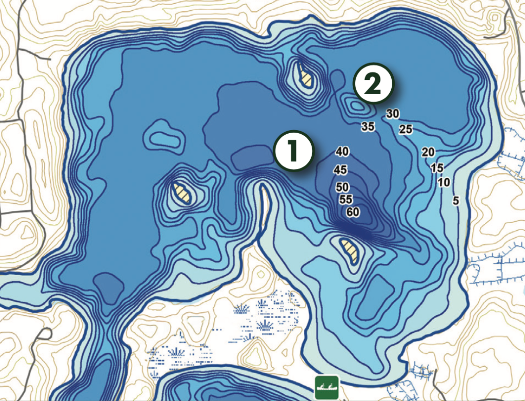 Locate main lake points (1) that lead into deep water. These are areas that bass can move up and down from deep to shallow water quickly, as warm and cold temperatures are inconsistent early in the season.