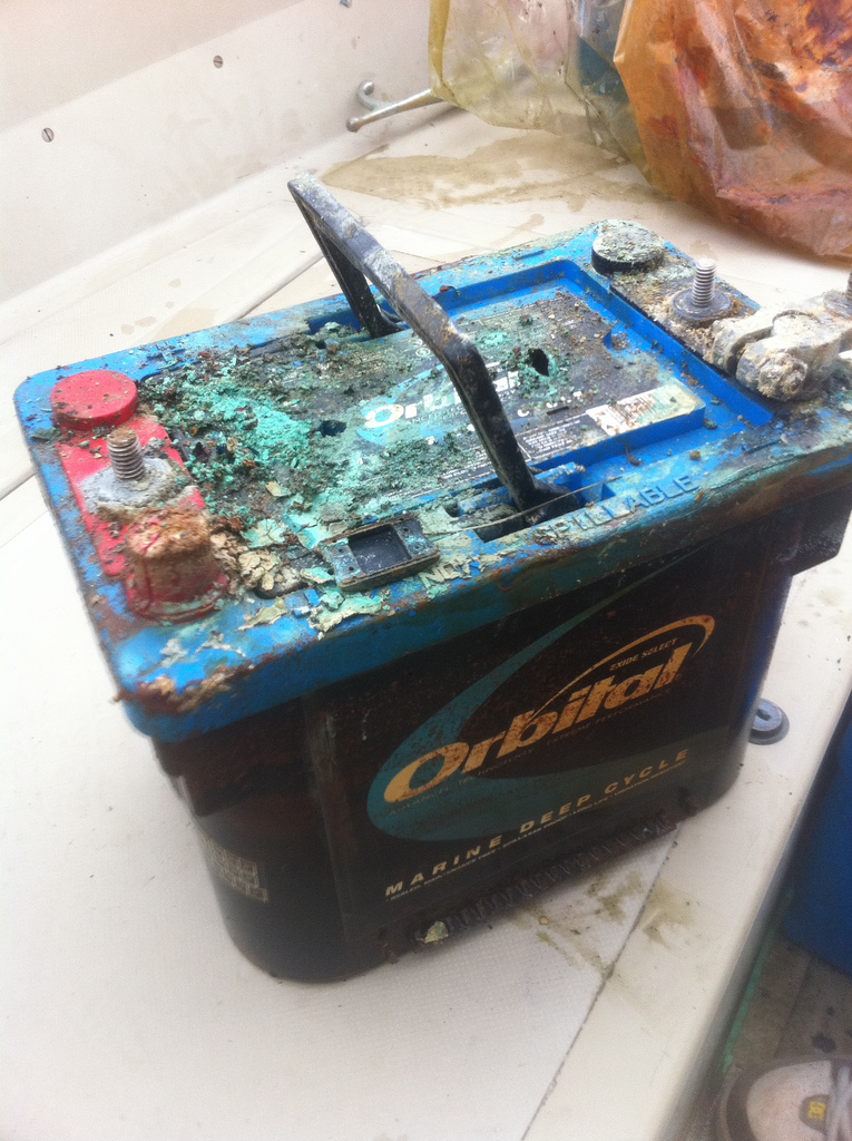 While we are talking about batteries, there are some Coast Guard regulations that have to be adhered to. First, at least the positive post has to be covered with a rubber boot or the battery in a box so a metallic object will not come in contact with it. During a recent seminar we conducted, we were told of a boater whose metal fuel tank came in contact with the battery terminals… that was a very bad boating day. Second, batteries need to be secure. At least a 90-pound pull from any angle shouldn’t move it more than one inch. Just yesterday I removed a single “plastic wire tie” about 25 inches long that was securing a battery on a 17-foot Boston Whaler.