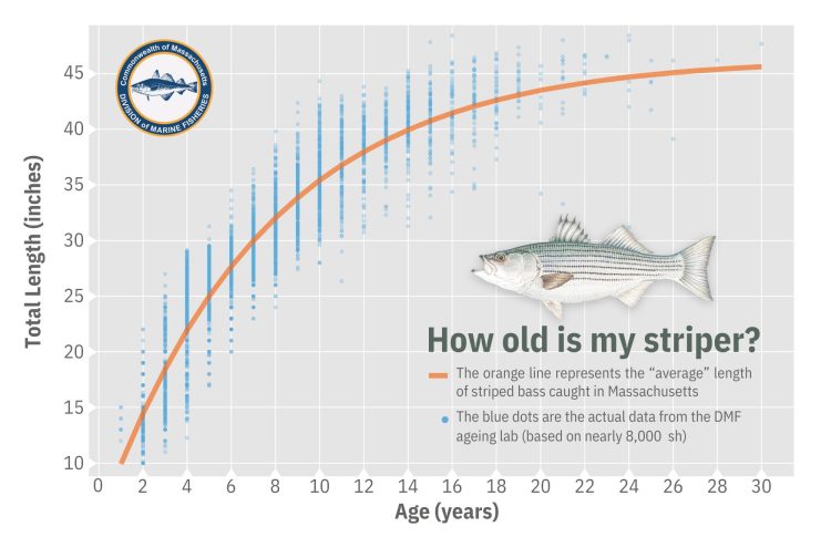 As an example, last year we produced a striped bass length-age calculation chart based on data submitted on nearly 8,000 fish! These charts have been a hit on the internet and have been a popular item for the anglers to take home from the DMF booth at fishing shows all winter. Using the chart to estimate the age of your catch is a fun tool, but the underlying data is also really important. Length and age data recorded from SADCT samples are used by stock assessment biologists to estimate long-term population structure. Understanding age, length, and growth enables biologists to more effectively manage popular saltwater species by tracking overall population health, growth, and mortality rates.