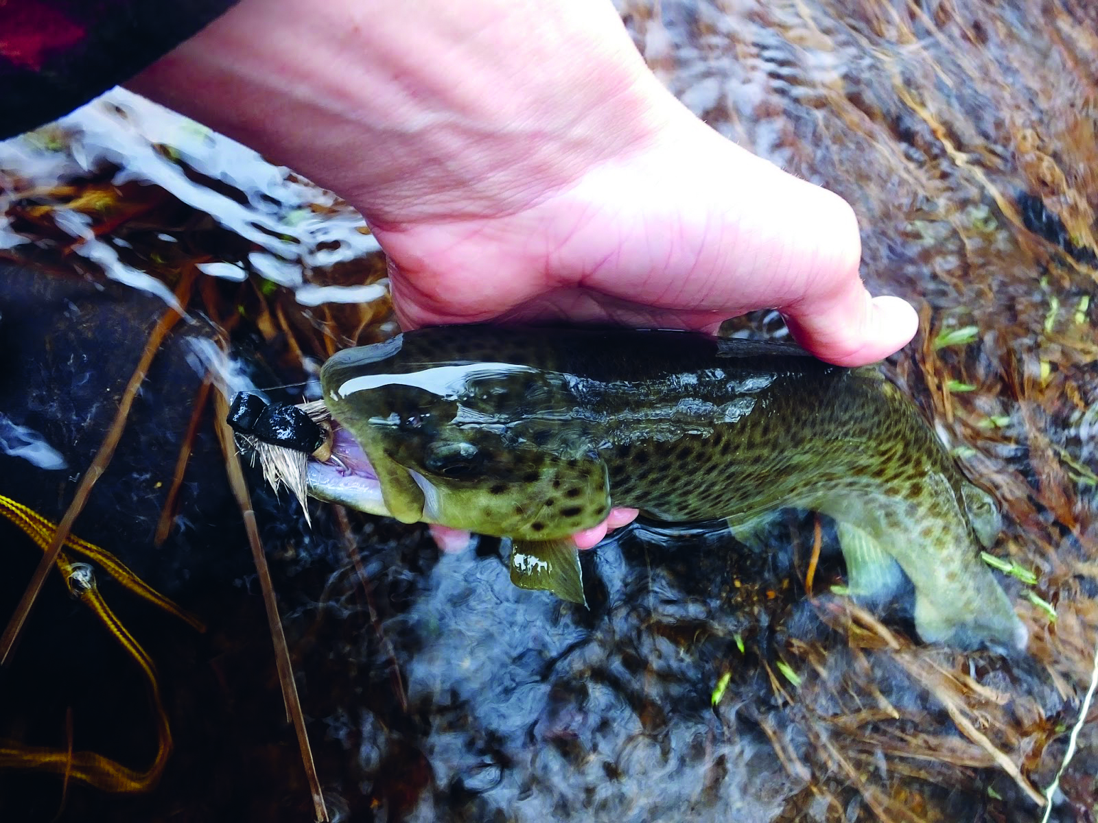 In the days following a stocking, the fish are often aggressive enough to violently strike a topwater fly cast straight upstream and stripped fast. It’s thrilling to have a large brook trout leap clear out of the water to take a fast-moving mouse or gurgler.