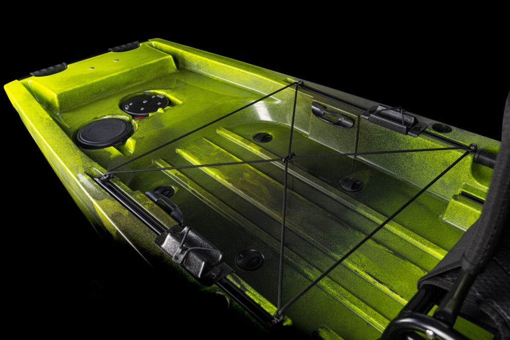 Behind the seat, in the stern of the kayak, there are two bungee-chord latches on either side of the boat for split paddle storage. Even on a pedal kayak, carrying a paddle is essential. Not only does it help with launching and landing, when the pedal drive needs to be lifted from the water, but in the event of an emergency or damage to the drive system, a paddle can be a true life saver. Between the split paddle storage is a spacious rear deck that is fitted with fixed bungees for securing a large tackle crate or a cooler to carry hydration, food, and/or bled-out fish.