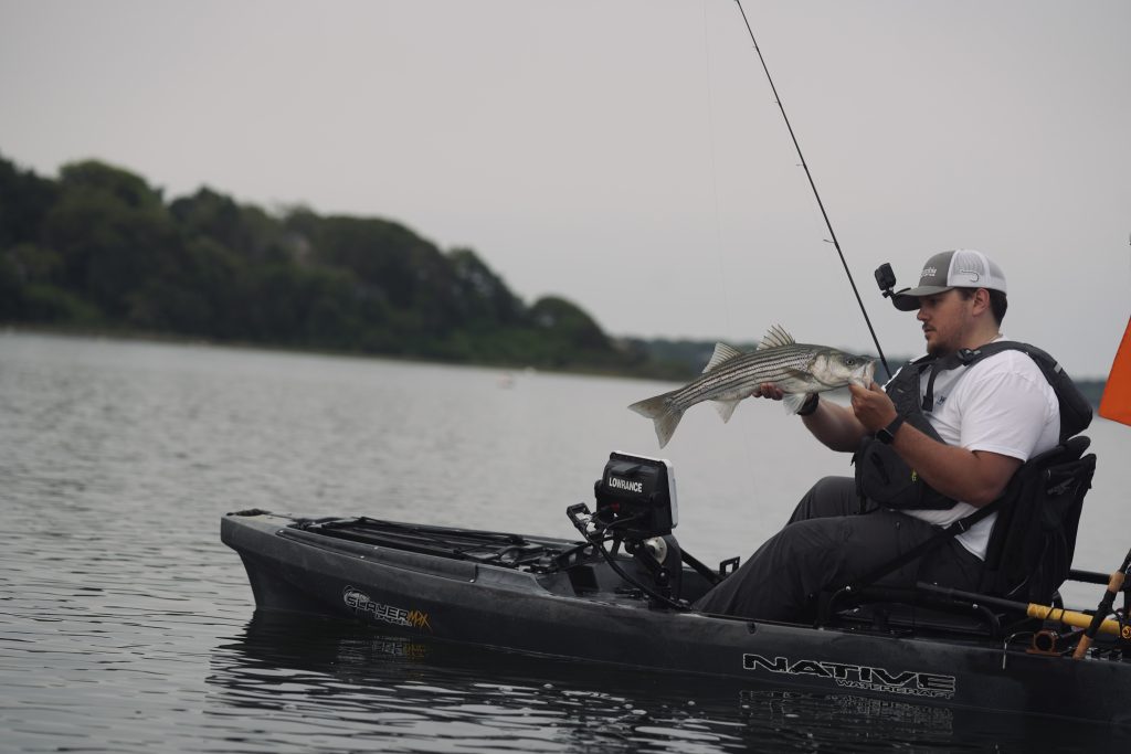 I’ve had many kayaks, each one more angler-friendly than the next, but the buck stops with the Slayer Propel Max 12.5. As a big guy who frequently targets striped bass in open water, I need a boat that is balanced and sturdy, because more often than not, striped bass feed most aggressively in unfavorable weather and sea conditions. At 12.5 feet long and 34 inches wide, it’s a truly versatile fishing platform that allows the angler to seamlessly transition from fishing glass-calm backwaters to the ocean. The boat’s rounded edges and flat bottom make it a safe platform to stand and cast for sight fishing purposes or improved casting accuracy, even in slightly choppy seas.