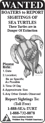 Of the four species of sea turtles found in our waters, three species are “endangered” and one is “threatened,” so every sighting is important. Leatherbacks are the easiest to see and to identify, mostly due to their large size, slate gray or black color, and dorsal ridges. Sightings of leatherbacks represent over 50% of the reports in the hotline database. The other species are smaller and harder to see. Reports of them, however, are especially important as we try to learn more about how these turtles use our waters as critical feeding habitats. Loggerheads appear brown/ orange, but Kemp’s Ridleys and greens are very difficult to tell apart at sea, even though Kemp’s Ridleys are more gray than brown. We appreciate any reports of sea turtles, no matter how little detail is seen. Thanks to all who have contributed sightings, and pass on the word to your friends and fellow boaters. For those who have yet to sight their first sea turtle, here’s hoping this will be the year, (and make sure to report it).