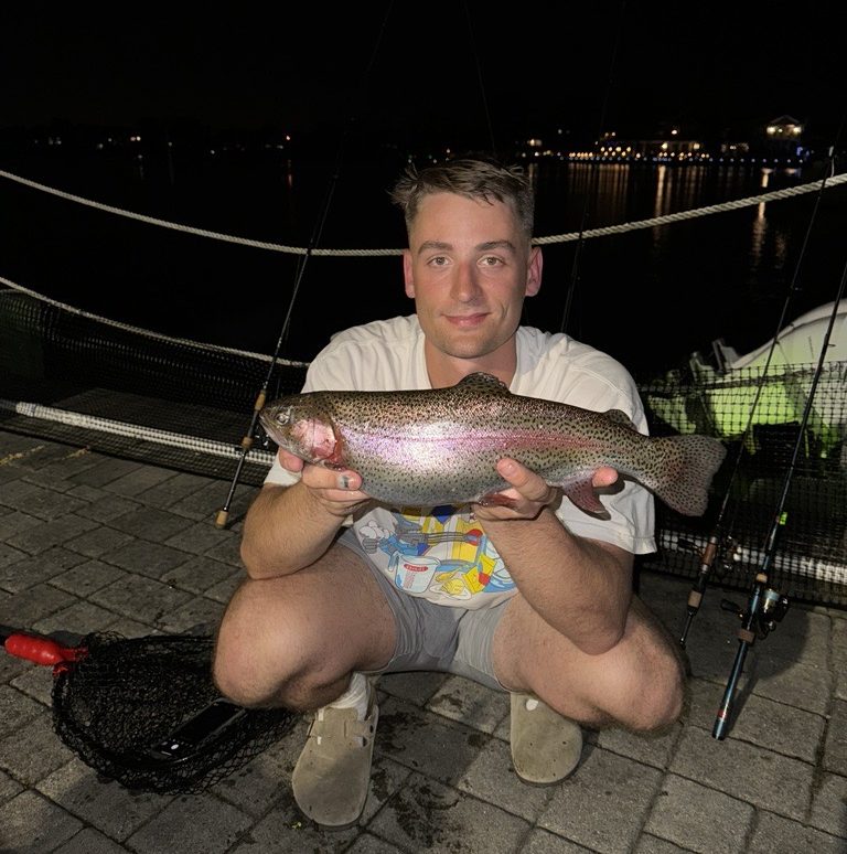 After twitching it around in the water column beneath the lights for a few minutes, the trout showed no interest. It wasn’t until D’Eufemia dropped the worm to the bottom and held it dead still that he felt the bite. He set the hook, the line started running, and it was on. A couple minutes later, he was holding the lost salmonid in his own two hands.