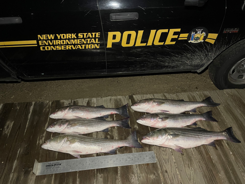On the evening of July 30, ECO Day conducted fishing compliance checks at a small village park in Northport, Suffolk County, and observed an individual pull a small boat up to a dock and offload a large cooler. Officer Day checked the cooler and discovered six striped bass all measuring greater than the maximum size allowed of 31 inches. The Officer issued the subject tickets for possession of out-of-slot striped bass, possession of over the daily limit of striped bass, and failure to have a valid marine registry. The fish were confiscated and donated to a local wildlife rehabilitation center for osprey and bald eagles.