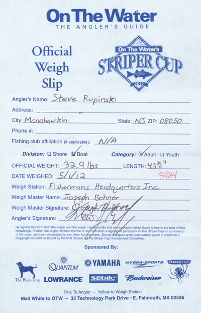 We got our first weigh slip of the 2012 Striper Cup today.