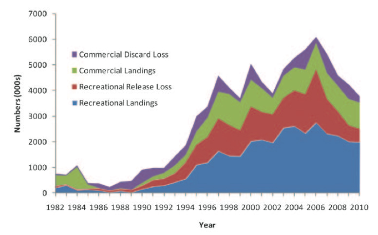 Striped bass have formed the basis for one of the most important fisheries on the Atlantic coast for centuries. Early records recount their abundance as being so great that at one time they were used to fertilize fields. However, a combination of overfishing and poor environmental conditions led to the collapse of the fishery in the 1980s. Through the hardship and dedication of both commercial and recreational fishermen, the stock was rebuilt (according to legal/scientific definitions). After the reopening of many state fisheries in 1990, recreational harvest grew to a peak of just over 2.7 million fish in 2006, while commercial harvest has averaged nearly 1 million fish per year.