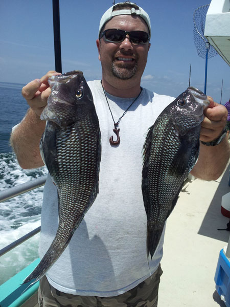 Black Sea Bass – Anglers are still hooking up with sea bass consistently. Fish are being found in around 80 feet of water on the bottom. Pictured is Rob Olints with some nice sea bass. He was using squid strips on a hi/low rig with a three inch pink squid hoochie as a teaser. The sea bass numbers are great and anglers are having a blast with them.