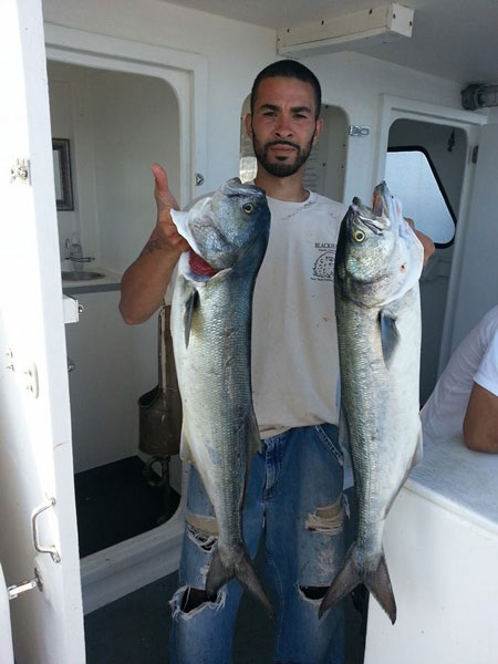 Bluefish – Bluefish are keeping anglers busy all over. A lot of smaller blues are being caught from the surf. Dunking bunker chunks will get you some decent fish and there are tons of fresh bunker to snag and net. The chopper blues are more easily found from boat, though. Diamond jigging for blues is a no brainer and is always fun. Pictured is Luis Feliciano with two big blues.