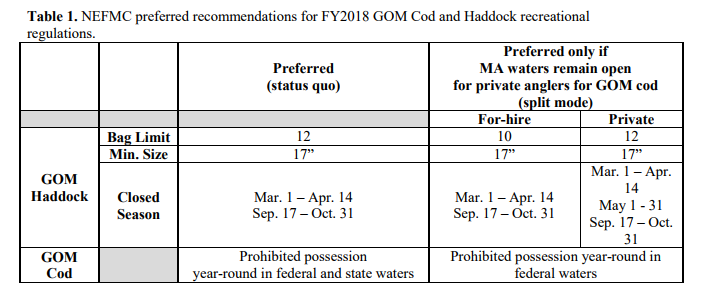Background: DMF adopted a 1-cod limit for private anglers in the state waters portion of the Gulf of Maine (GOM) in 2015, after the catch of GOM cod by all recreational anglers was prohibited in federal waters. (DMF did not support the federal closure as it prohibited private citizens from accessing a public resource while continuing to allow a commercial fishery to access the same resource.) Recently, The New England Fishery Management Council (NEFMC) voted to recommend that if the Commonwealth of Massachusetts continues to allow private recreational anglers to retain one GOM cod per trip, there must be additional constraints on haddock. Specifically, the Council recommended closing the haddock fishery in May for private recreational anglers, and lowering the haddock possession limit from 12 fish to 10 fish for the for-hire fleet (while keeping their season open in May).