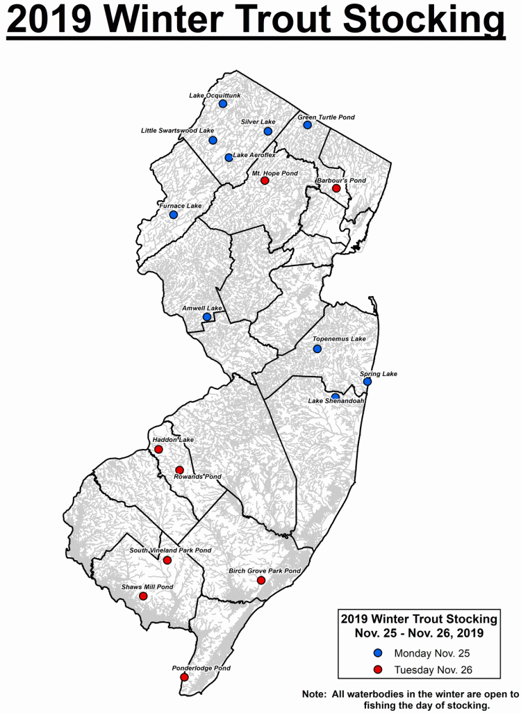 Monday and Tuesday, November 25 and 26, approximately 4,800 two-year old Rainbow Trout, averaging 14-18 inches, were stocked in 20 designated ponds and lakes across New Jersey. The Winter Trout Stocking Program is the final one each year, bringing the total of trout stocked from the Pequest Trout Hatchery in Warren County to more than 600,000.