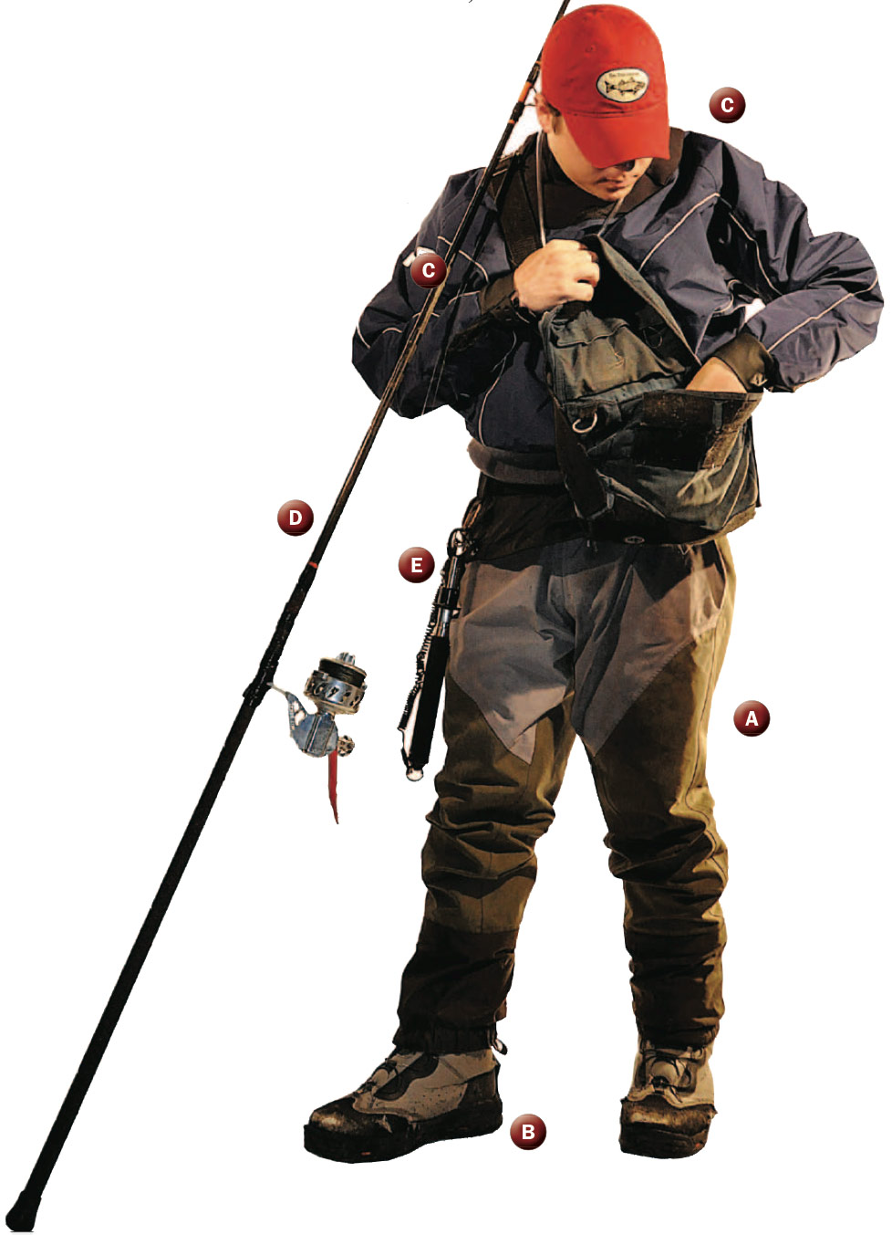 D. Don’t Sweat It: When Picking a pair of waders, consider the amount of walking you’ll be doing. Trudging in the sand can work up a sweat, making a pair of lightweight, breathable waders the most comfortable option. Stockingfoot waders with wading boots will be more comfortable on long walks, but be sure your waders have a gravel guard to keep sand from washing into the boots. (Frogg Toggs Anura Waders; $159.95 | Anura Wading Shoe; $79.95)