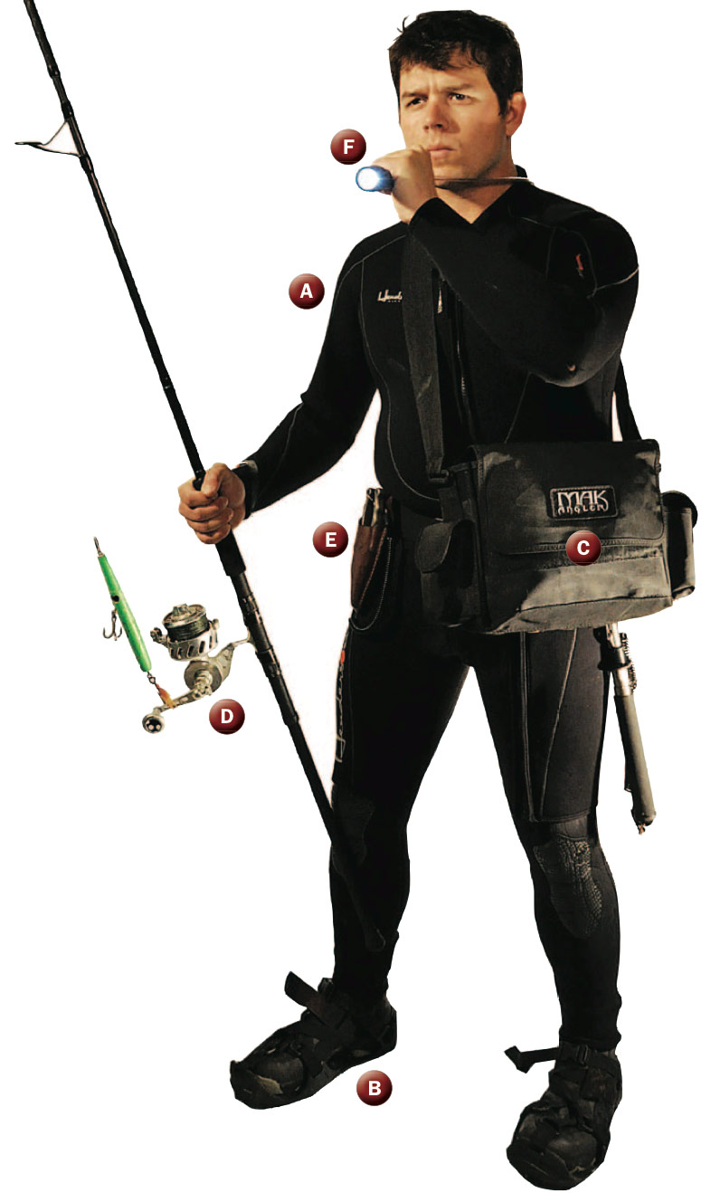 D. Keep on Reeling: A reel that can survive being completely submerged on a regular basis is a must for wetsuit fishing. Unsealed reels will require regular and intensive maintenance, making watertight reels a more attractive choice to wetsuiters. (Van Staal VS250 reel; $769.00 | G. Loomis IMX surf rod; $525.00)