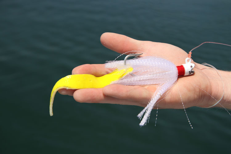 “The leader length for the bucktail depends mostly on the current strength,” explained Kess. “The harder the tide is pushing, the longer you’ll want to make the leader. The long leader helps keep the lure away from the sinker, allowing it to maintain good action, and it provides the fish an extra second to react once the sinker comes past on the drift. At least that’s how it all works in theory. Choose a size seven-ought bucktail that weighs three-quarter to one-and-a-quarter ounces and tip it with a standard five-inch strip of pork rind.”