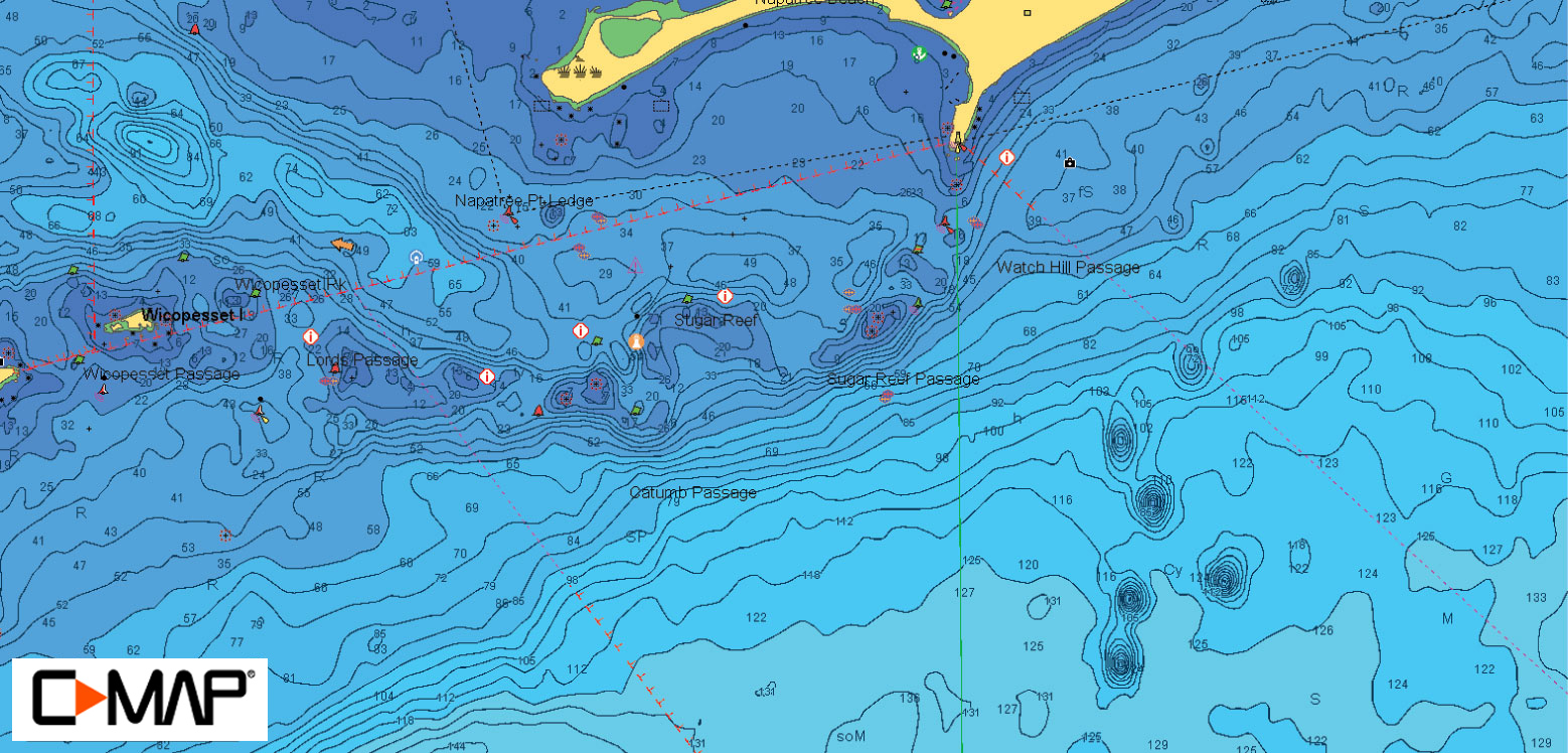 Click on map for hi-res bathymetric custom map provided by C-MAP