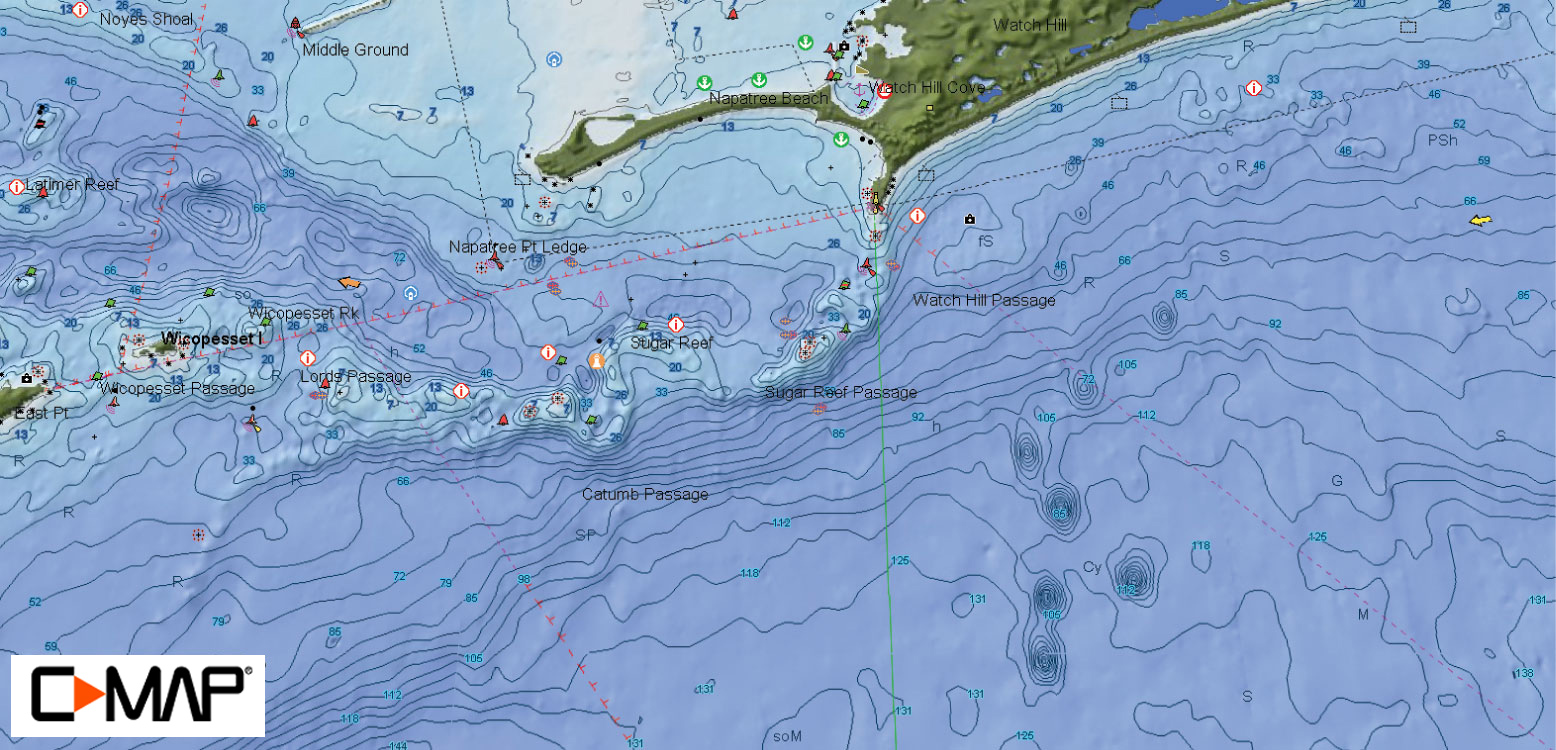 Click on map for custom hi-res bathymetric 2D map provided by C-MAP