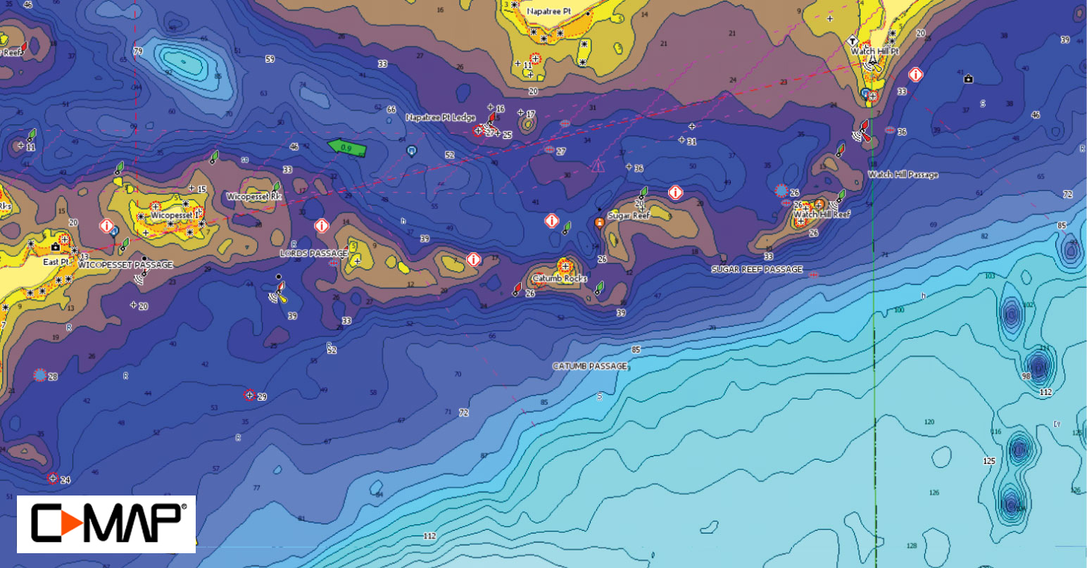 With such a complex bottom topography of rocks, reefs, and passages, you’ll depend heavily on your chartplotter and a detailed map to navigate safely around this fishy structure. Look for moving tides to create current rips that attract striped bass and bluefish to feed, but use caution as there are areas on Sugar Reef and of course Catumb Rocks where a boater can run aground. You’ll want to use your common sense and follow the lead of other boaters and fishermen working the area.