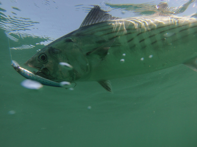 I had my eye on a nice slick about 3/4 a mile offshore, so Justin, myself and his GOPRO headed off. Four casts in and literally as I was saying “I’m going to flip out if i hook a fish” my reel started SCREAMING. I knew immediately it was a bonito or falsie. Justin got the GOPRO set up and these pics (there are many others) tell the rest. I fought the fish for 20 good minutes and it pulled us about 1/4 mile east in the greasy conditions (see below). It took me another 15 to get the hooks out as I forgot pliers and then we used a “nica trick” we learned watching the locals in Popoyo, Nicaragua when we were on a surf trip — feed the surf leash through the fish’s gills to trade it back to shore. It was one of the greatest moments of my fishing career. It’s been funny to overhear people talking about someone landing a bonito when we are out at bars. We have also met people since who said they heard our screams up and down the southside beaches that Saturday.