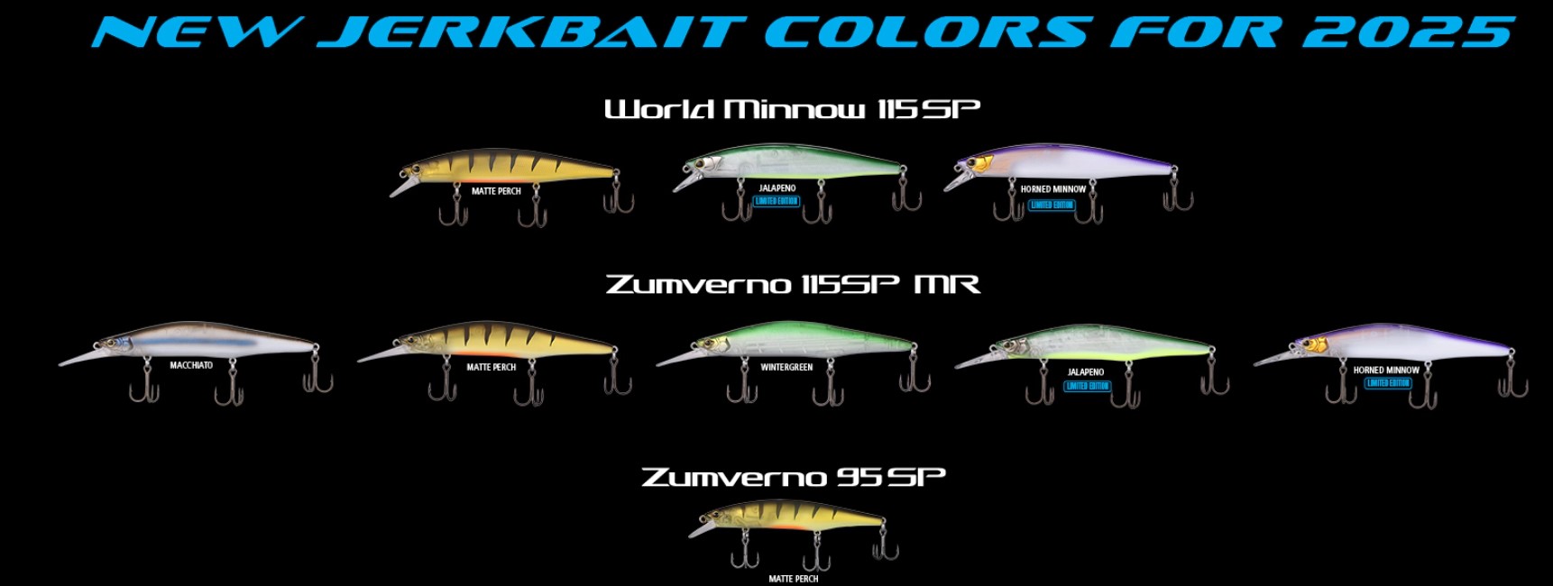 The Shimano World Minnow has been an office favorite since it was released a couple years ago with its Flash Boost, giving the lure the shimmering appearance of a baitfish on the pause, and its aerodynamic shape aiding in casting distance. The other premium Shimano jerkbaits getting new colors are the Zumverno SP95 and Zumverno 115SP MR. The Zumverno baits have a wide-bill design gives the jerkbait a lifelike swimming action with an erratic side-to-side darting movement and enticing body roll.