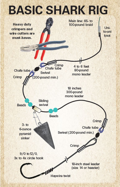 Making your own shark rigs can be just as satisfying as tying your own flies. You can make them as simple or as ornate as you would like, so experiment with different types of wire, mono, hooks, weights, swivels, beads, and rattles.